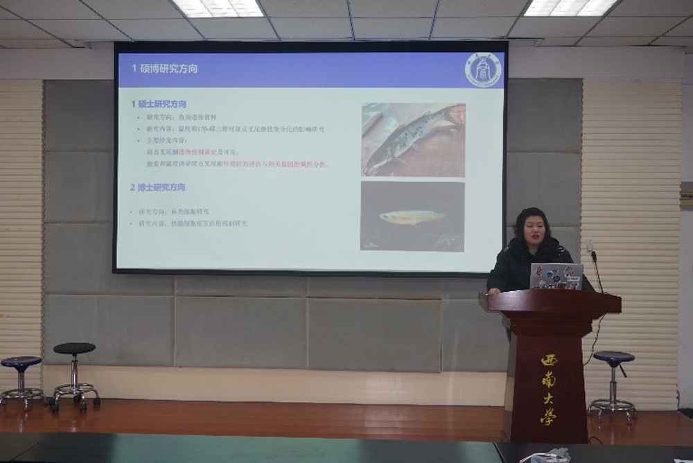 刘昕同学以“低鱼粉饲料中添加茶树精油对大口黑鲈生长性能和生理健康的影响”为主题,从“低鱼粉饲料中添加茶树精油对大口黑鲈生长、肝脏和肠道健康的影响”、“低鱼粉饲料中添加茶树精油对大口黑鲈脂代谢、抗氧化能力和免疫的影响”以及“松油烯-4-醇对脂多糖诱导的大口黑鲈肝细胞炎症、抗氧化和凋亡反应的影响”三个方面详细阐述自己在硕士毕业论文的主要内容。