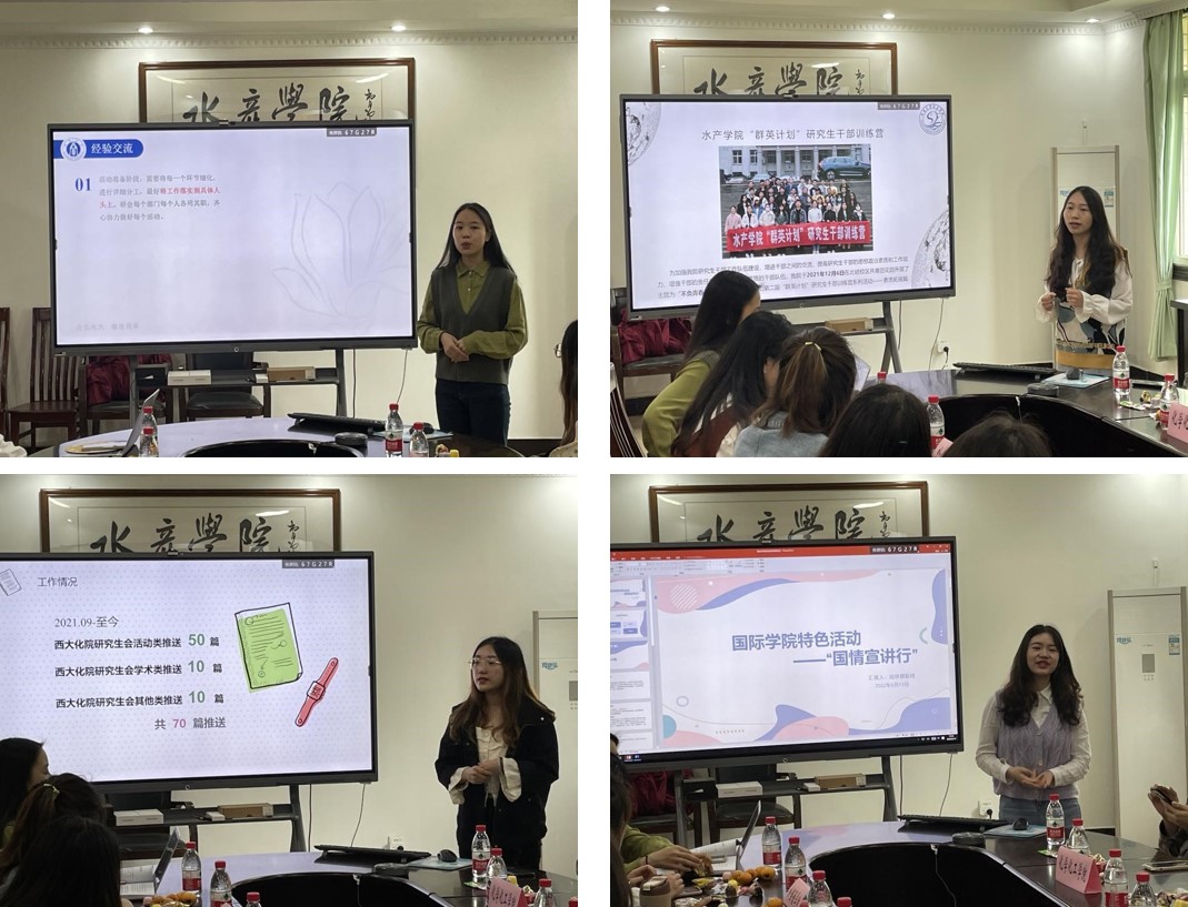 交流分享中,外国语公司、bevitor伟德、化学化工公司和国际公司四个公司研究生会的负责人就本公司特色工作进行了介绍,比如外国语公司的第十四届研究生英语教学技能大赛和“一站到底”研究生知识竞赛,bevitor伟德的“群英计划”研究生干部训练营活动,长江大保护-“鱼”你有约主题科普活动,化学化工公司的“化写青春,携手并行”师生趣味运动会、“共化青春,羽你同行”羽毛球比赛、“化在当下,情系潼心”研究生寒假社会实践活动以及国际公司的公司品牌“紫云研学”系列活动和“国情宣讲行”活动。此外,大家还共同观看了国际公司获奖作品《西南记疫》。最后,同学们讨论了研究生会目前存在的一些不足,并对未来的研究生会建设纷纷提出了展望。