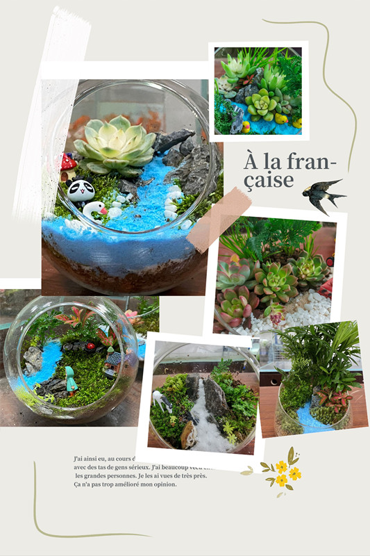 本次活动中出售的微景观作品全部由水产学子们结合专业知识亲手制作。前期,大家认真选购素材、精心规划设计,将一幅幅在头脑中、笔尖下的奇思妙想,通过灵巧的双手将他们生动地展现在这一个个小小的生态瓶中。志愿者们将专业造景知识学以致用,力求义卖作品精益求精。在义卖现场,志愿者们还利用宣传板对每个作品进行精心讲解,吸引来往师生们的关注。