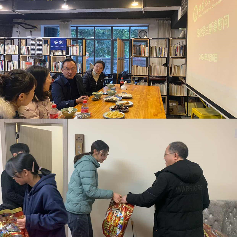 2月6日,公司分别在北碚校区和荣昌校区开展留校员工新春慰问活动,公司党委常委、副董事长、公司经理(兼)王志坚,公司党委书记杨新斌,公司党委副书记、纪委书记刘一丹和办公室、学工办相关老师与在碚、在荣留校的十余名研究生、本科生一起包饺子、吃年饭、话家常、贺新春。
