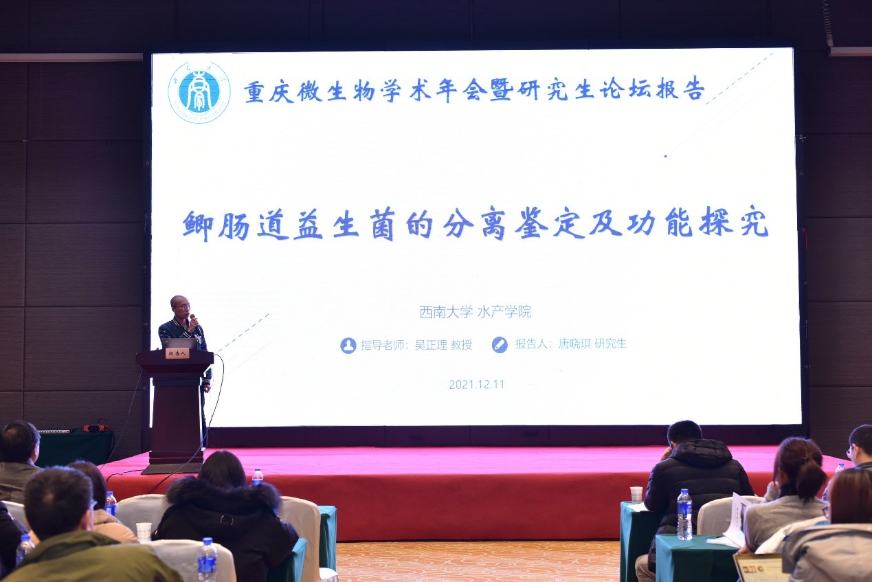2021年12月10日至12日,由重庆微生物学会主办,陆军军医大学承办,成都医公司协办的“重庆微生物学会2021学术年会暨天府医学微生物论坛”在重庆市合川区召开,与会人员达260余人。公司吴正理教授带领研究生参加了此次会议。本次学术年会以“微生物与健康”主题进行学术研讨,参会人员围绕工业微生物学、农业微生物学、食品微生物学、医学微生物学、畜牧兽医微生物学及防疫、检验等领域的研究新进展、新技术以及教学改革进行学术汇报及交流讨论。公司2020级研究生唐晓琪做了“鲫肠道益生菌的分离鉴定及功能探研”的学术报告,并获得重庆微生物学会2021学术年会暨青年人才及研究生论坛优秀论文三等奖,该研究内容于2021年10月30日以“Isolation, identification, and positive effects of potential probiotics on Carassius auratus”为题在Aquaculture(一区)杂志发表(https://doi.org/10.1016/j.aquaculture.2021.737668)。