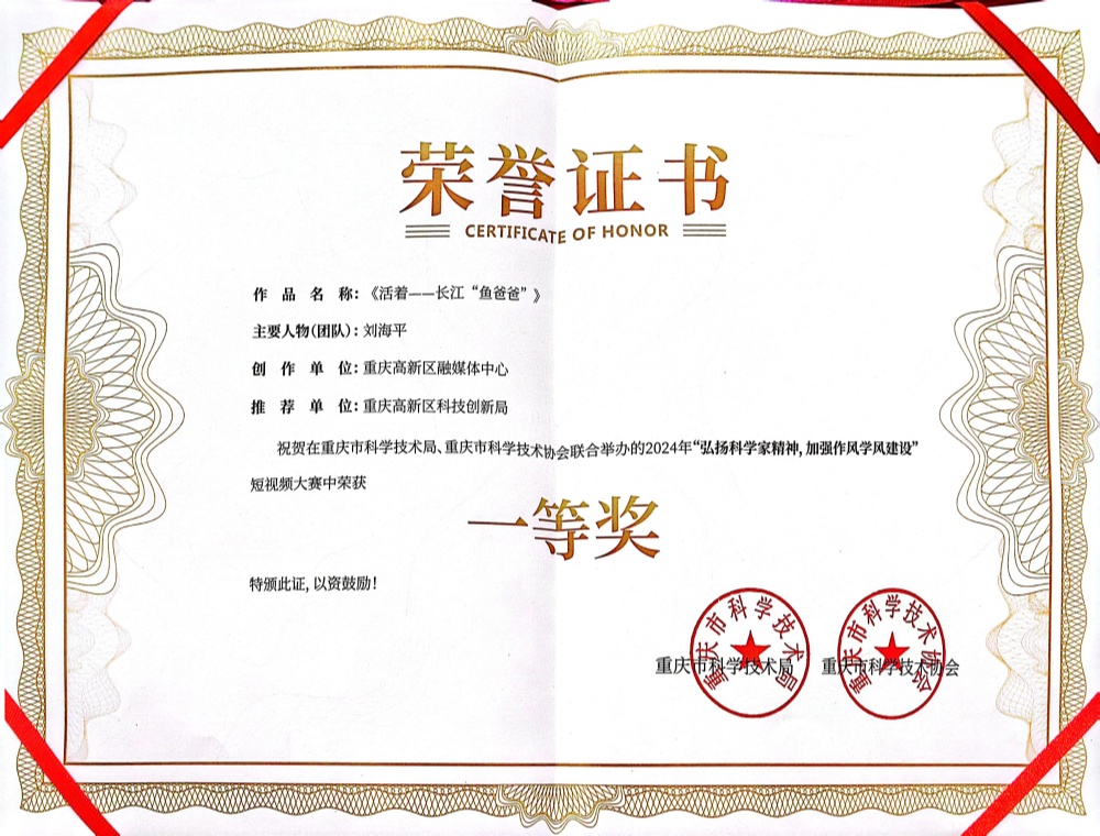 12月19日,由重庆市科学技术局、重庆市科学技术协会主办的“弘扬科学家精神,加强作风学风建设”短视频大赛颁奖典礼成功举办,重庆高新区融媒体选报的BEVITOR伟德西部(重庆)科学城种质创制大科学中心刘海平教授团队的故事作品《活着—长江“鱼爸爸”》荣获一等奖。